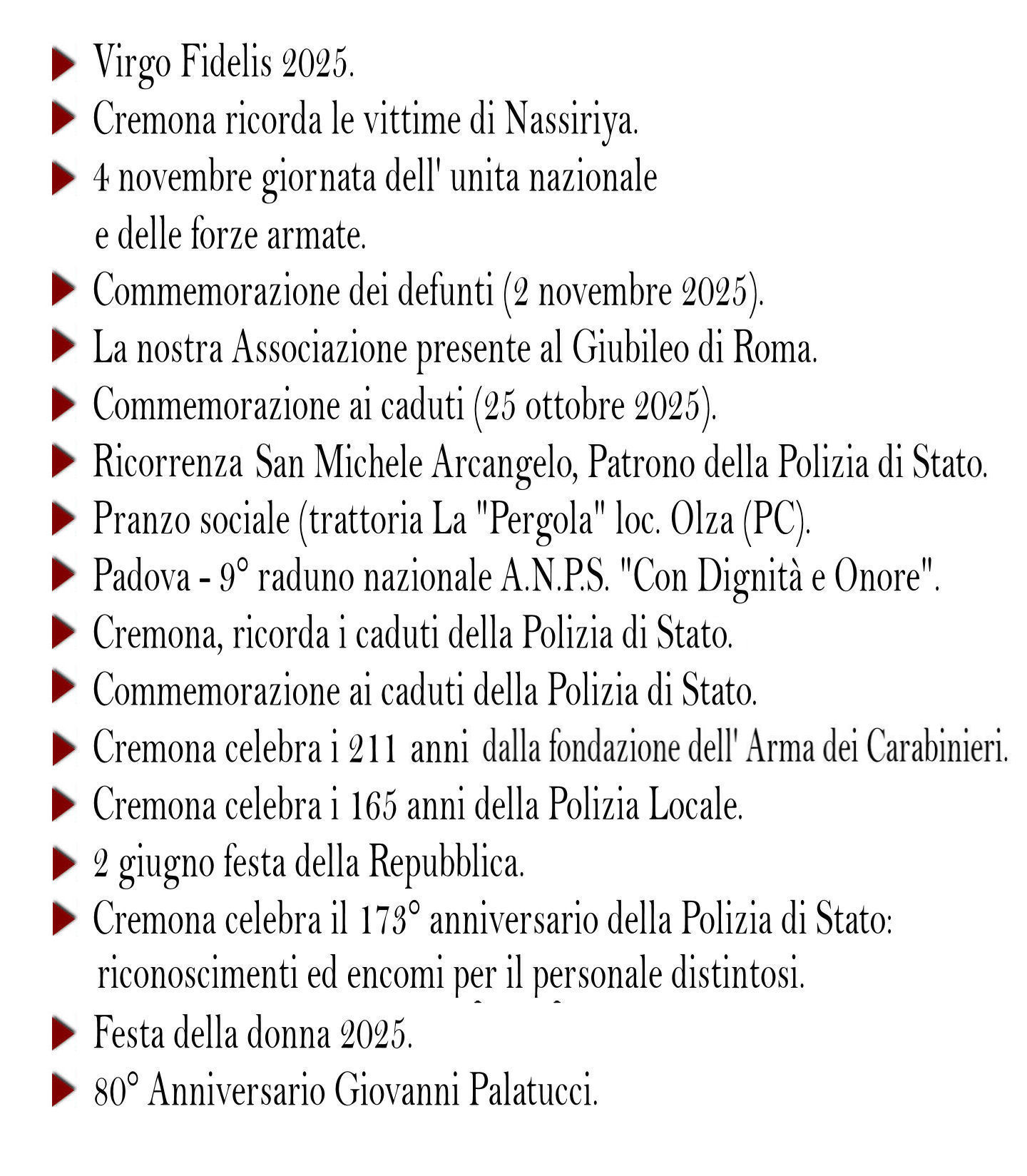 Il gruppo ideatori sito A.N.P.S. Cremona (g.i.s.A.C.), unitamente ai consiglieri A.N.P.S. Cremona Sezione "Luigi BOLLONI", ringraziano gli amministratori dei Siti istituzionali www.quirinale.it, www.poliziadistato.it, al Consiglio Nazionale ed all’Ufficio di Presidenza dell’ANPS, all’Archivio storico dell’ANPS e del periodico Fiamme d’Oro, all’Archivio della rivista Polizia Moderna ed all’Ufficio Storico della Polizia di Stato per la fonte di riferimento, nonché a tutti quei Siti e ai soci che hanno dato la loro disponibilità e di essere stati concretamente vicini all’iniziativa. In ogni caso si precisa che se qualcuno sostiene di vantare la proprietà, può comunicarlo all'indirizzo sottoelencato, il materiale interessato verrà immediatamente oscurato da questo sito, oppure se gradito, indicheremo la fonte (ind. web) del Sito in cui sono stati acquisiti i contenuti. Tel. 037231137 / fax 037231137 / E-Mail: anpscremona@anpscremona.it