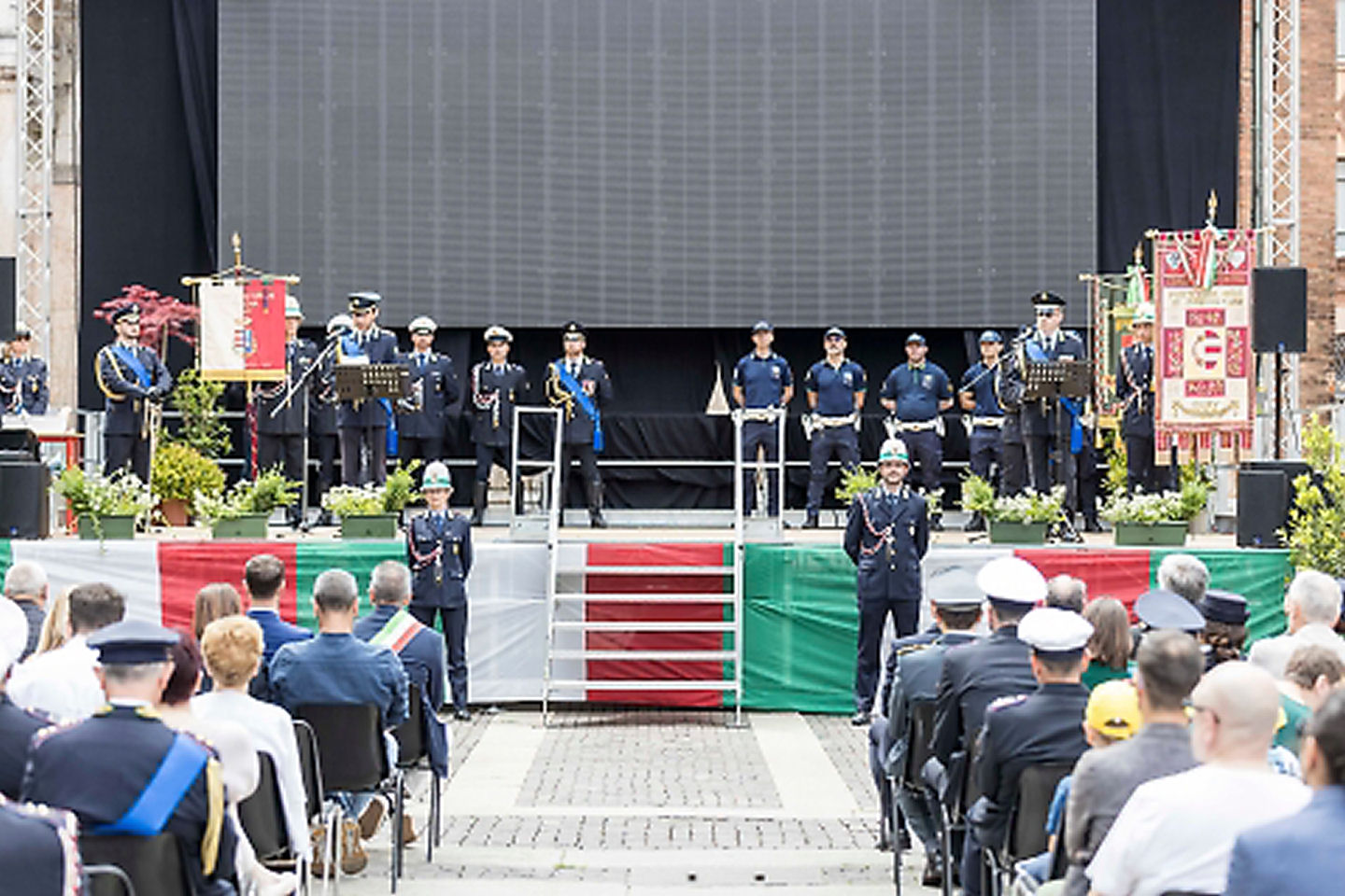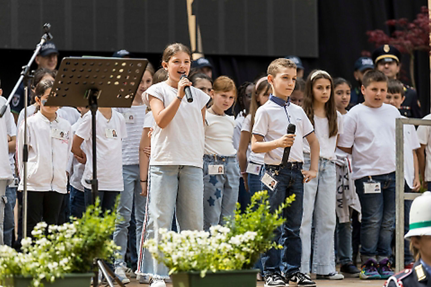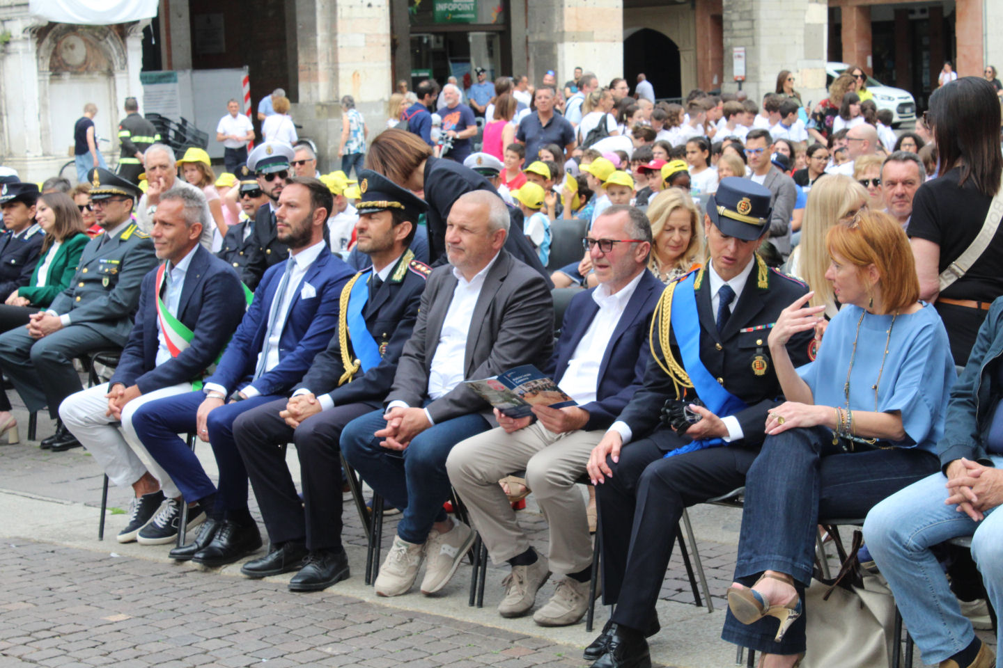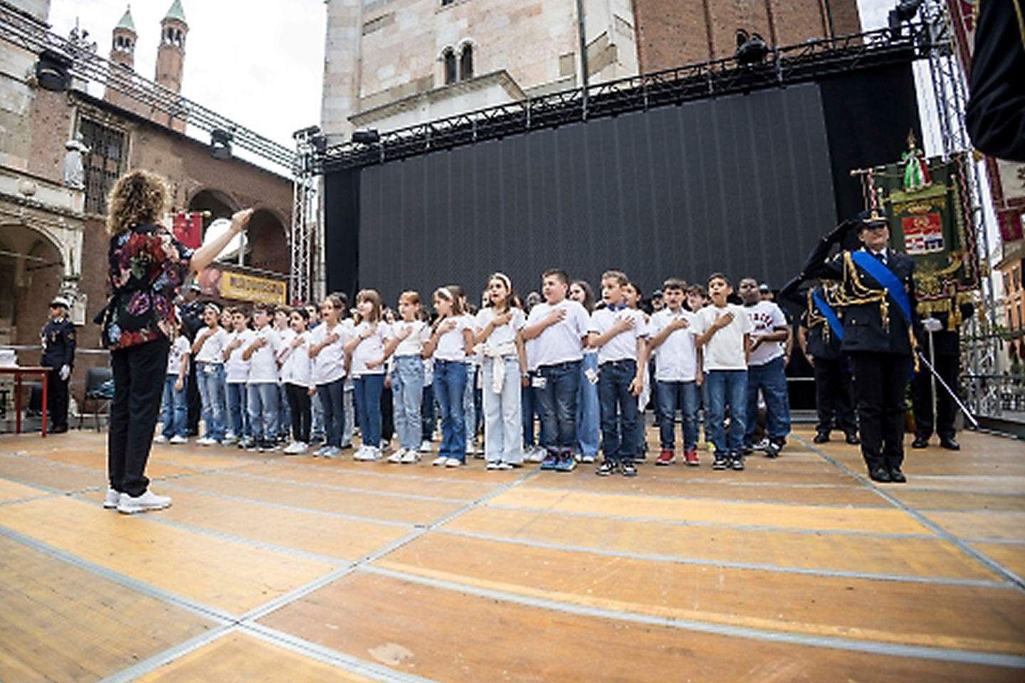 Non è mancato il coinvolgimento delle scuole: alcuni alunni della primaria Trento e Trieste, partecipanti a un progetto sulla sicurezza stradale, hanno eseguito l’inno nazionale dal palco.